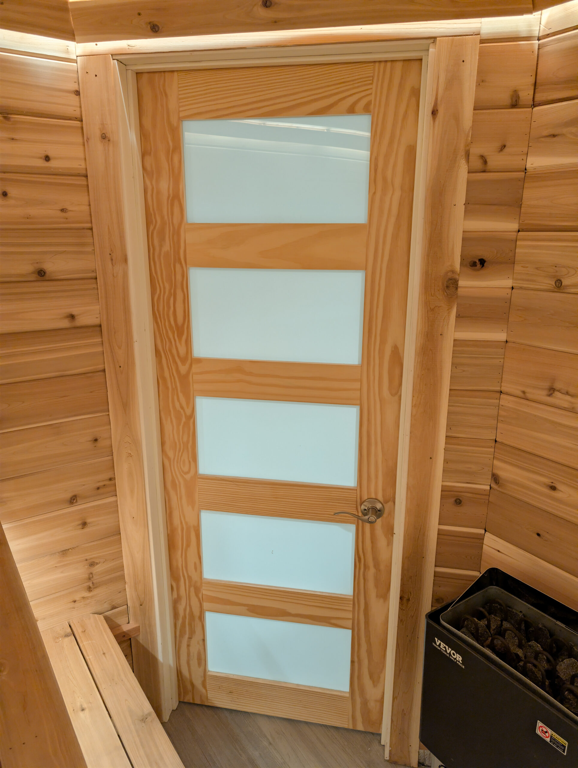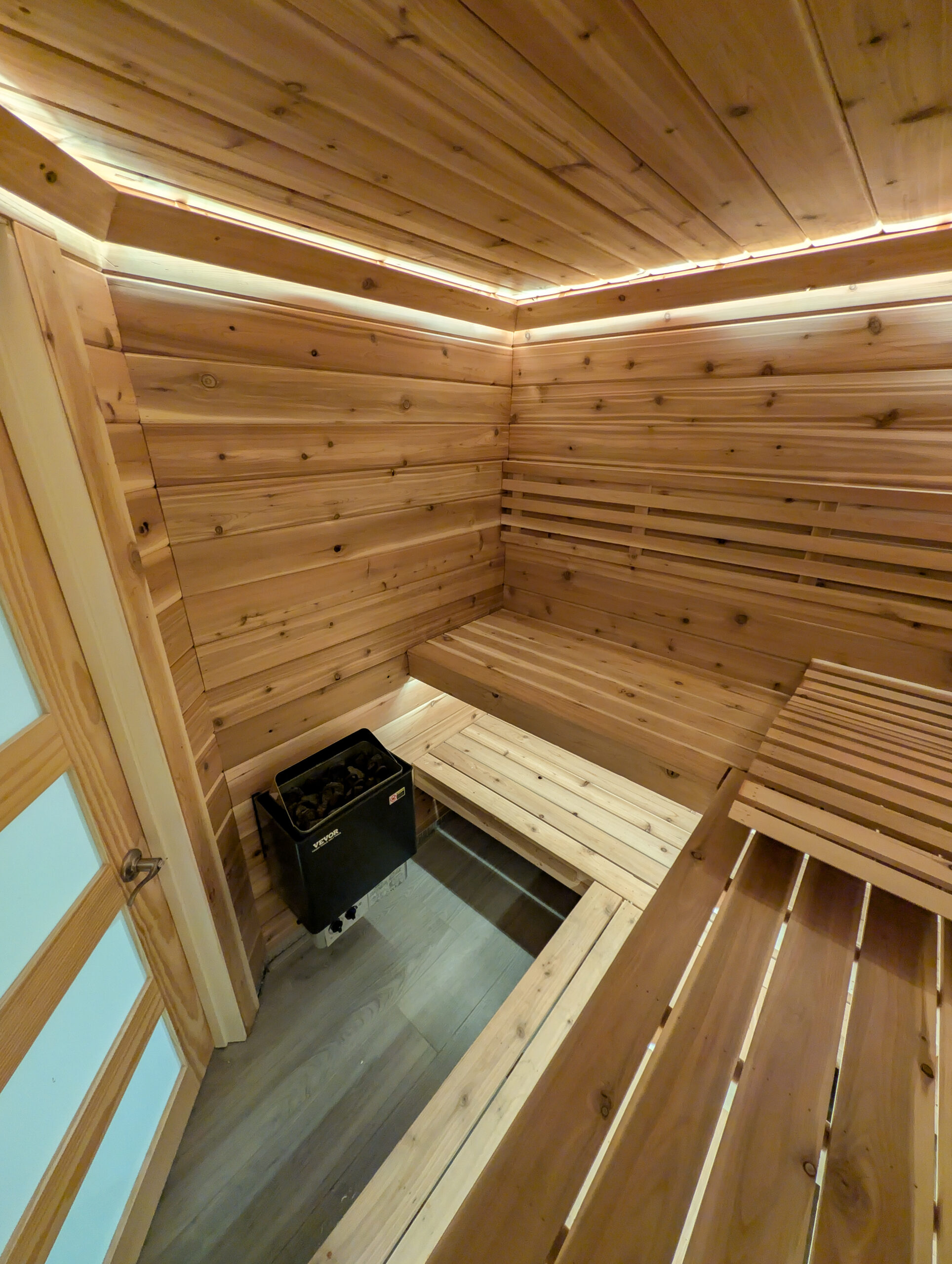 Elevate your wellness routine with a bespoke sauna experience. This custom-built retreat features premium Western Red Cedar walls and multi-level bench seating, designed for both comfort and aesthetic appeal. The integrated perimeter LED lighting creates a serene, ambient glow, while the high-performance Vevor heater ensures a consistent, deep-heating session. From the precision-cut wood slats to the sleek glass-panel door, every detail was crafted to turn a standard home space into a professional-grade sanctuary.