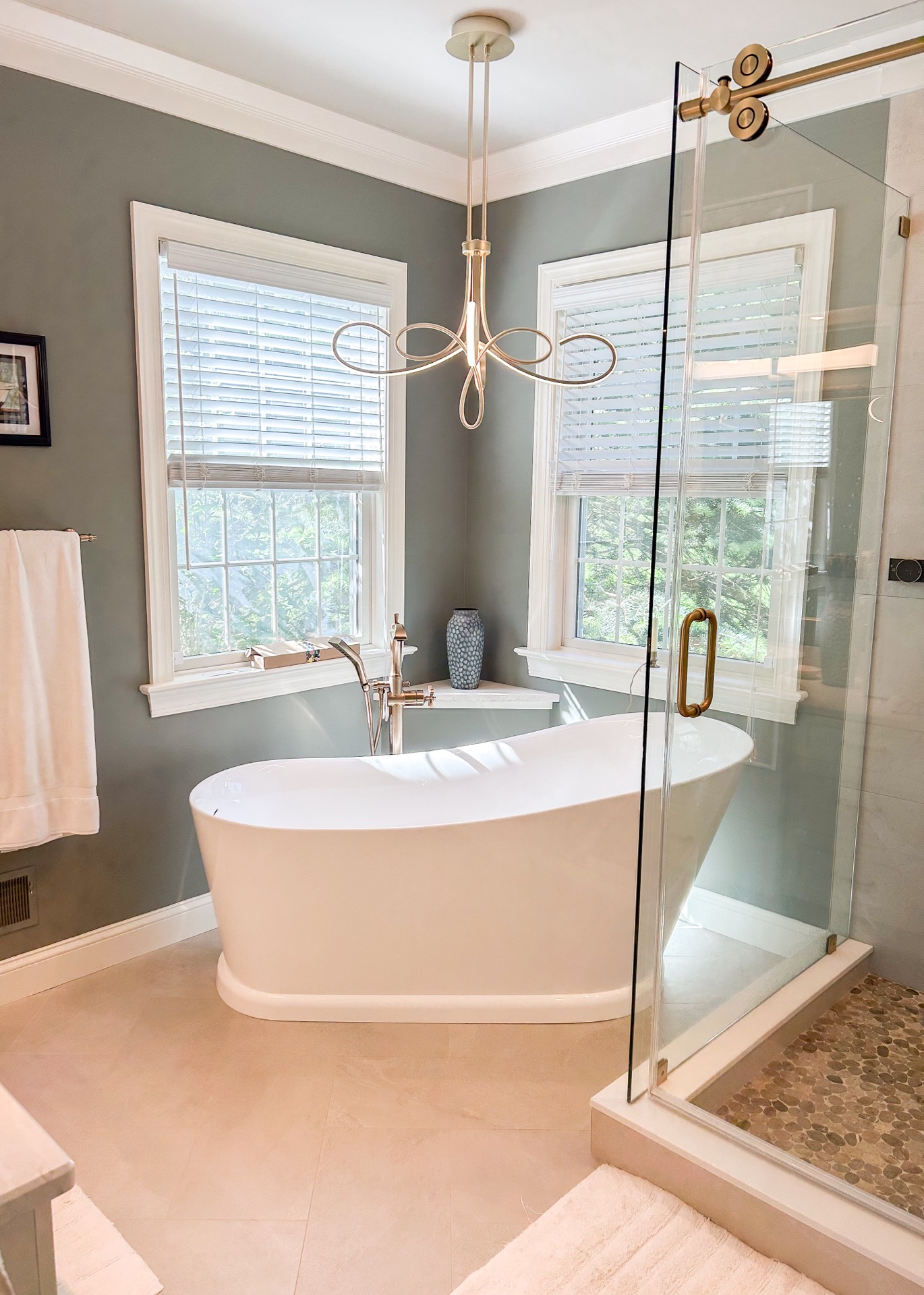Experience modern tranquility in this newly remodeled bathroom. A palette of cool gray tones creates a sophisticated and serene atmosphere, complemented by unique designs and fixtures. The space is a perfect blend of style and function, offering a peaceful retreat from the everyday.