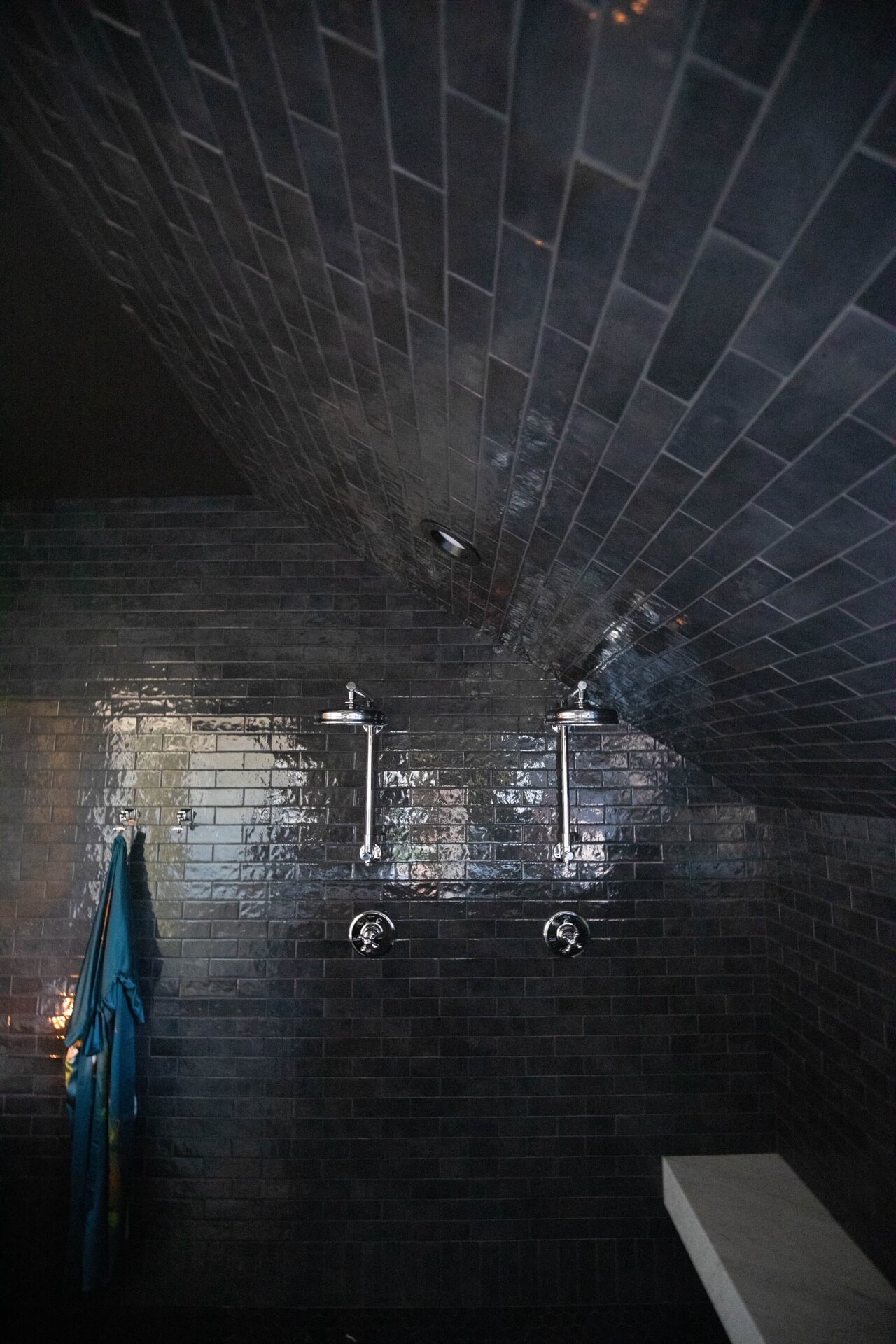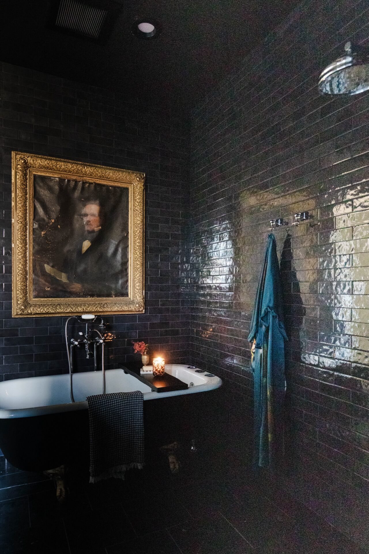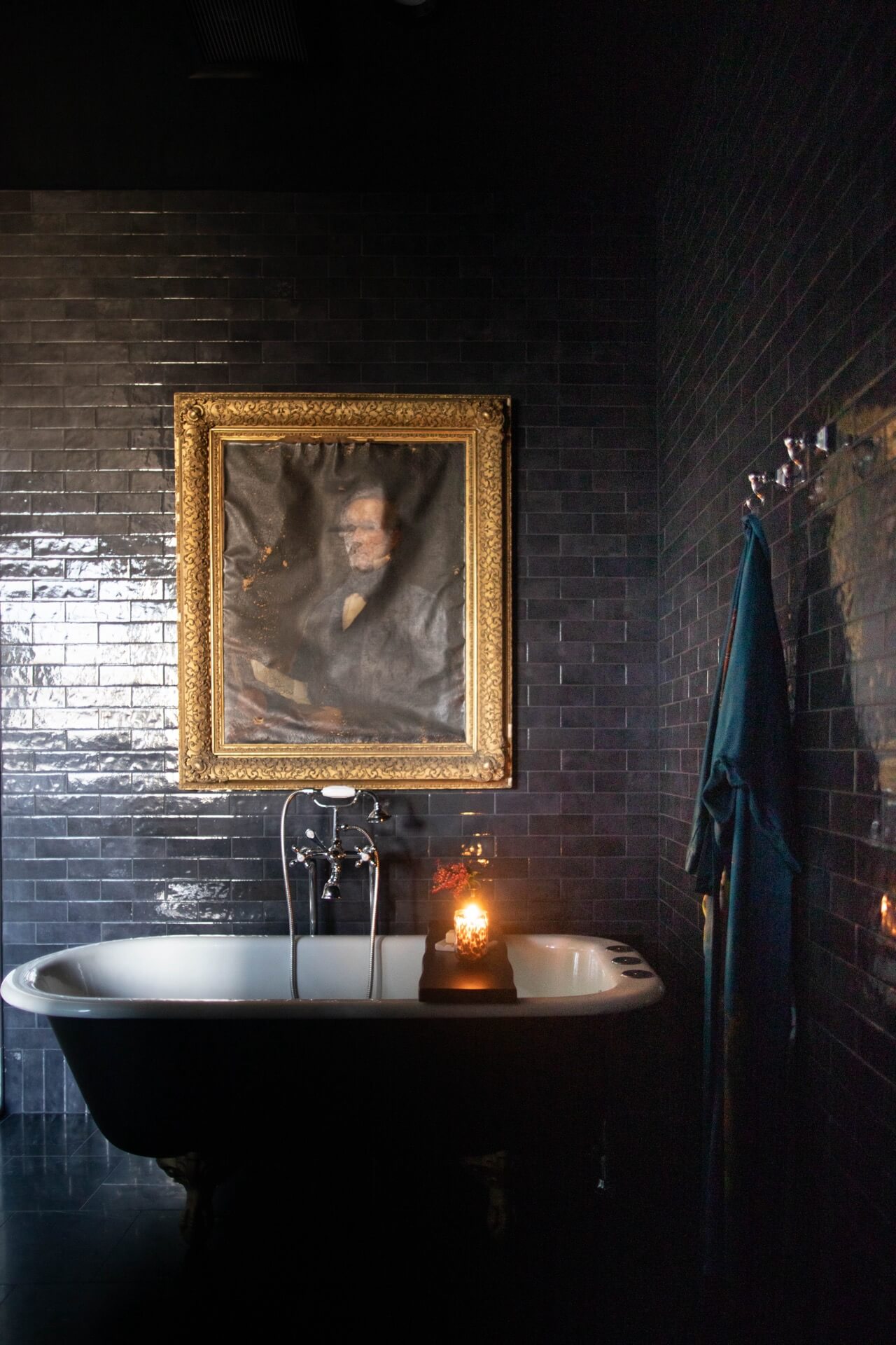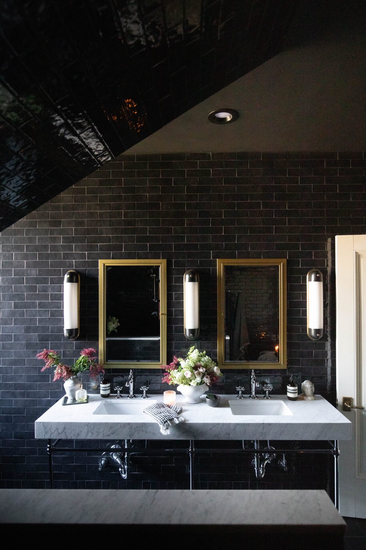 This stunning bathroom remodel demonstrates how bold design choices can create dramatic visual impact. The sophisticated black subway tile installation serves as the room’s striking focal point, adding rich texture and depth that transforms an ordinary space into something extraordinary. The deliberate contrast between the deep, dark tiles and crisp white fixtures creates a modern aesthetic that feels both timeless and contemporary.