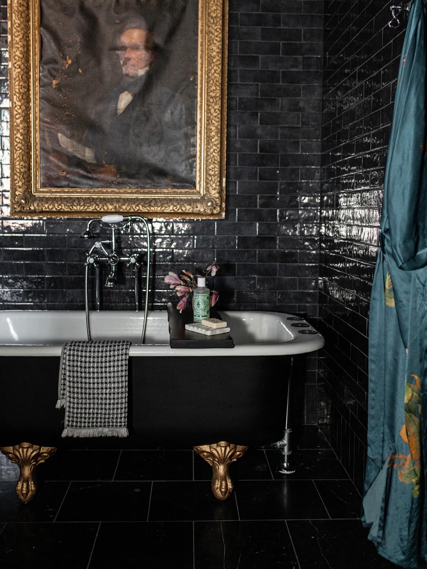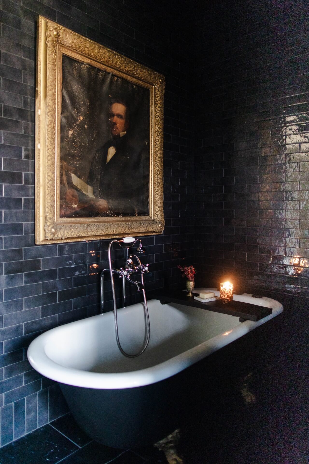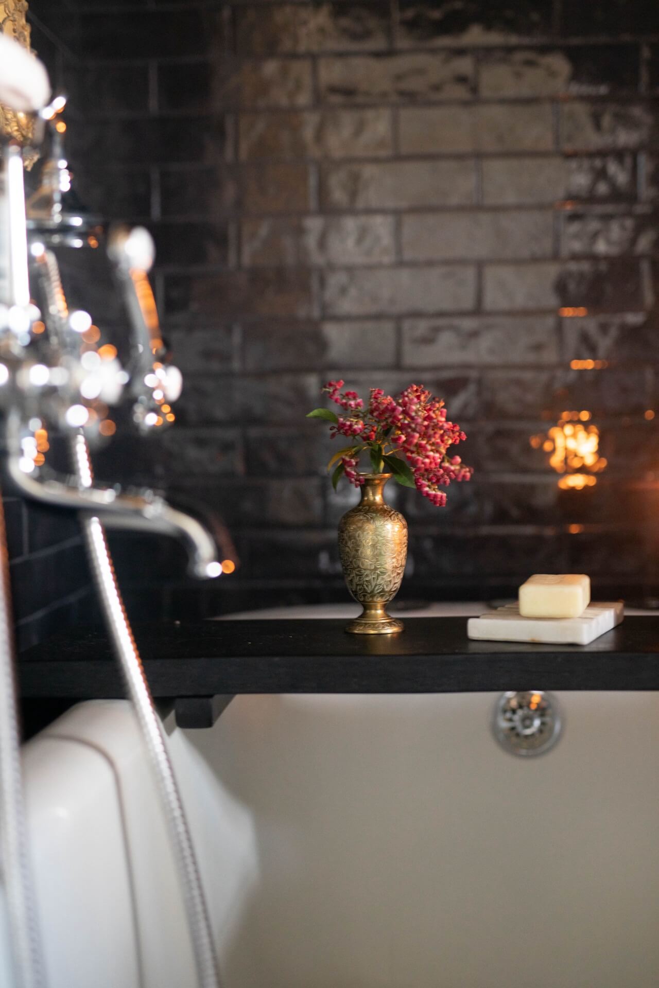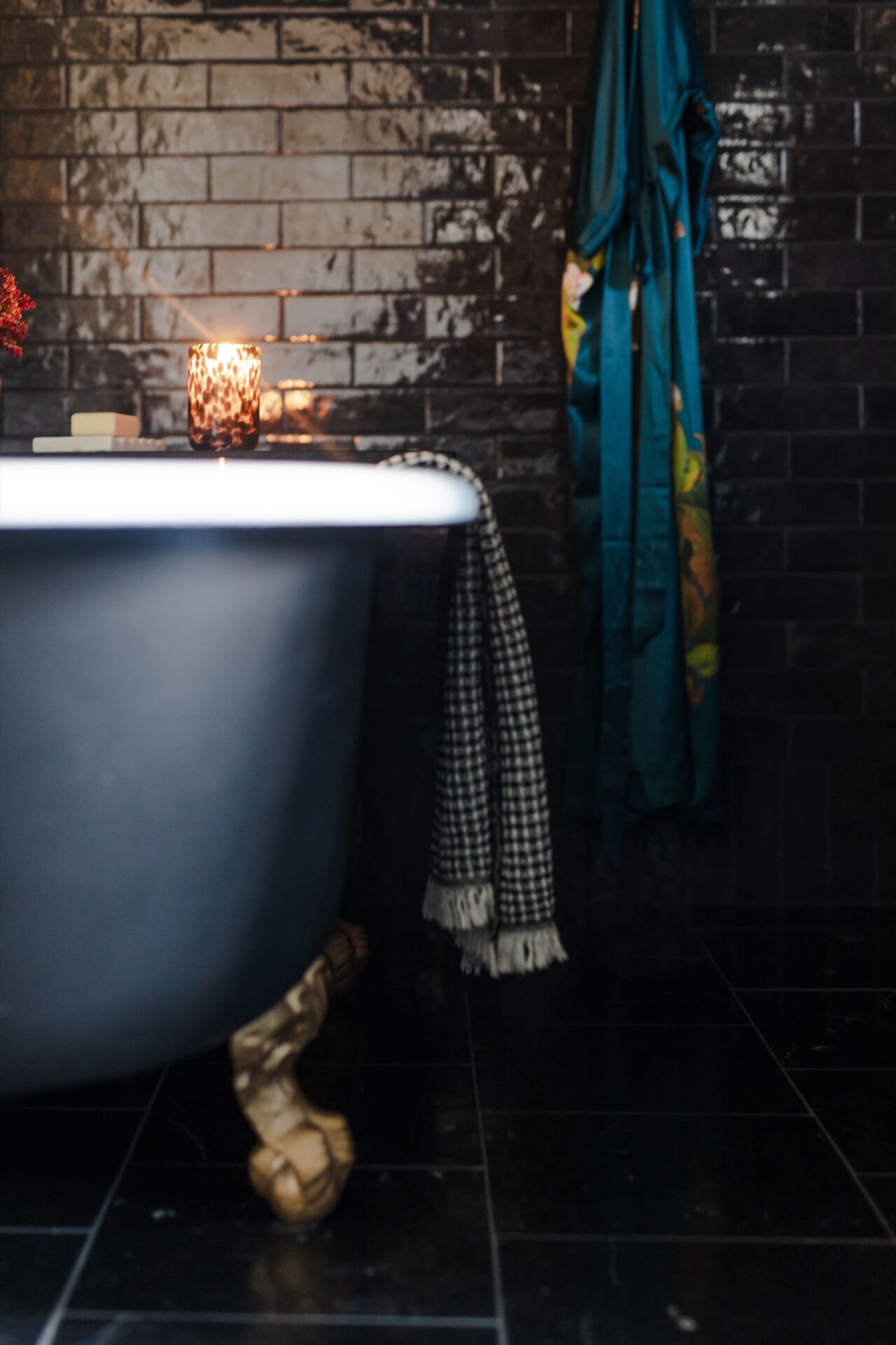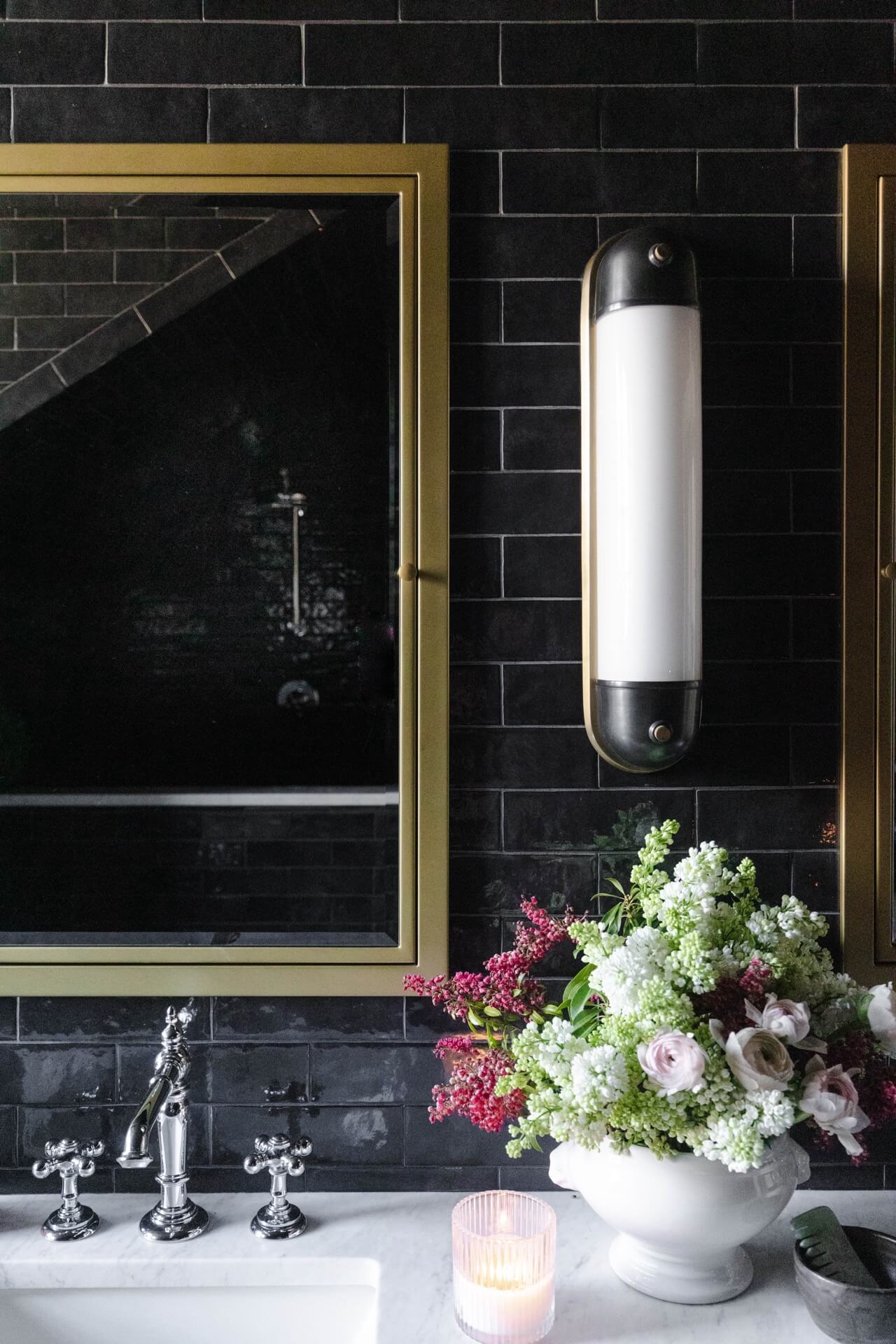 This stunning bathroom remodel demonstrates how bold design choices can create dramatic visual impact. The sophisticated black subway tile installation serves as the room’s striking focal point, adding rich texture and depth that transforms an ordinary space into something extraordinary. The deliberate contrast between the deep, dark tiles and crisp white fixtures creates a modern aesthetic that feels both timeless and contemporary.